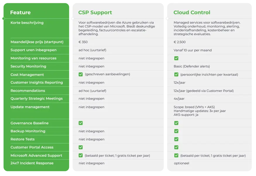 Met Azure Managed Services nemen we beheer en onderhoud van je Azure-omgeving over. Minder incidenten, voorspelbare kosten en een stabiel, veilig platform dat meegroeit met je product.
